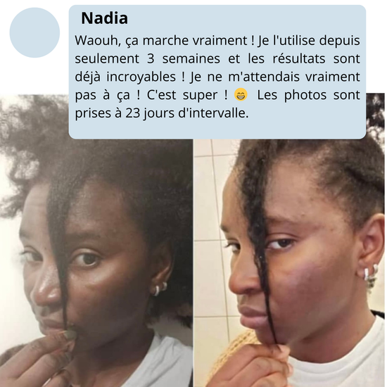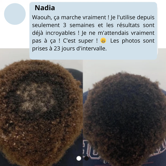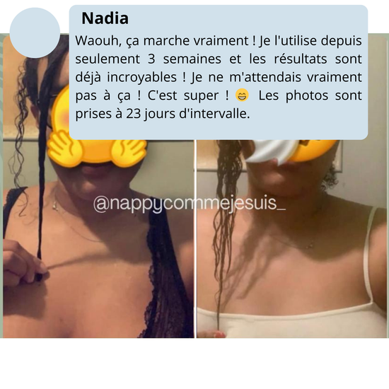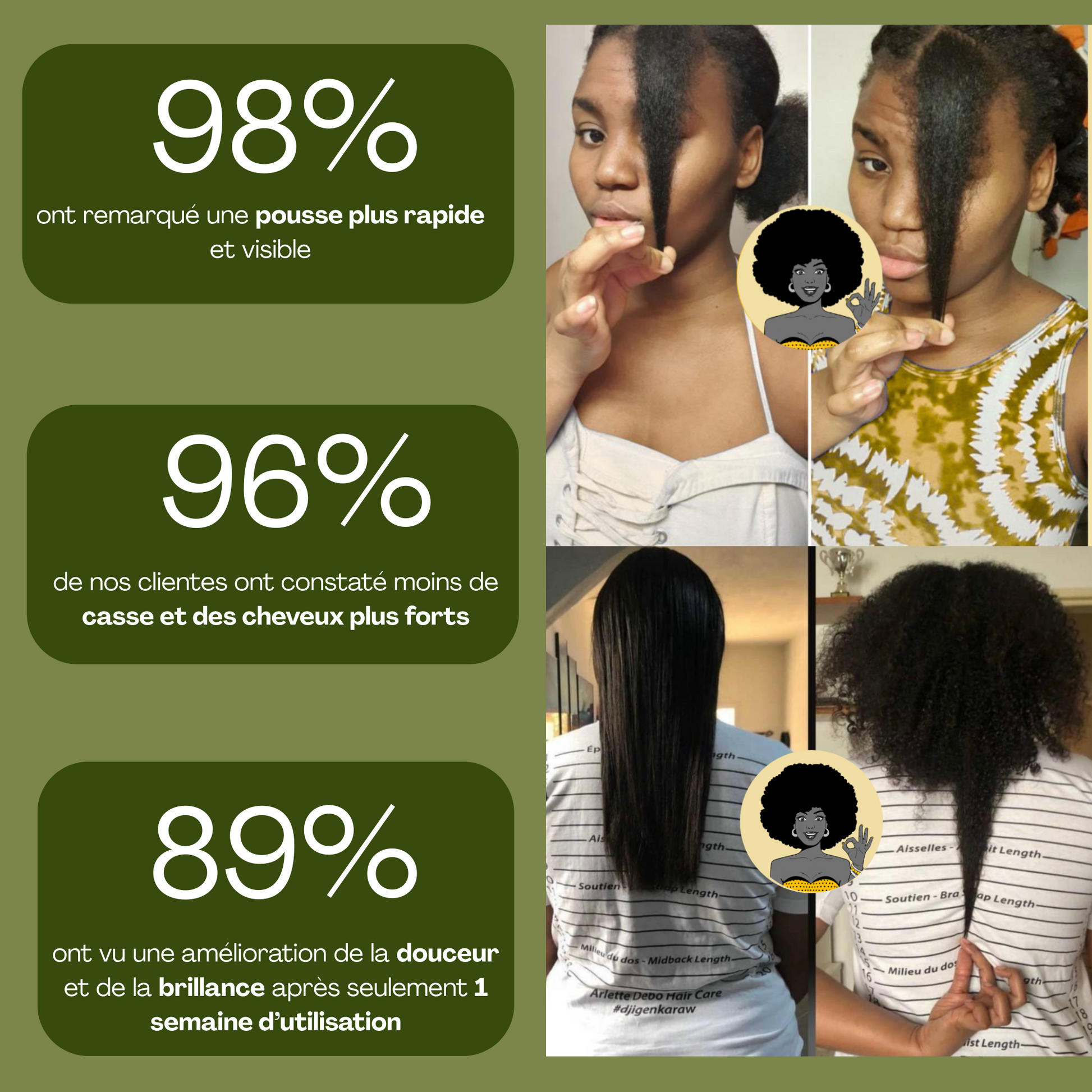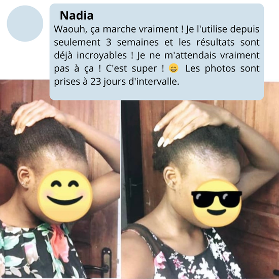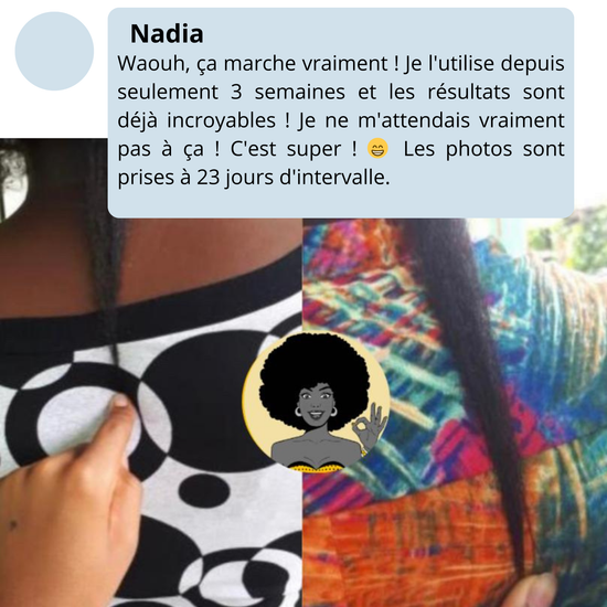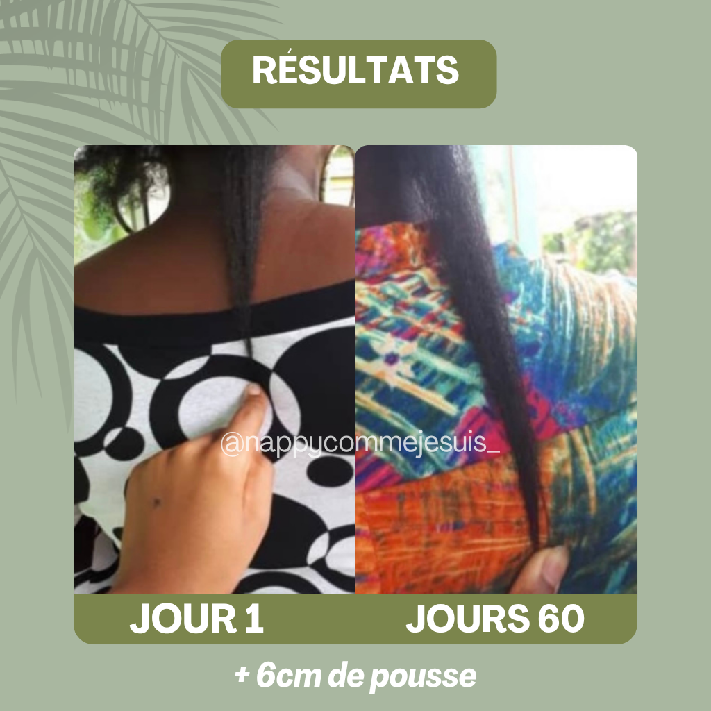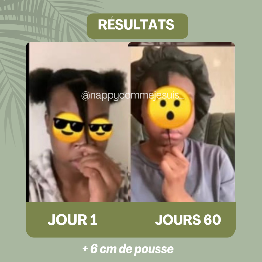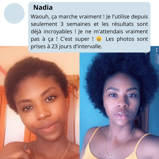 Certaines clientes constatent des changements dès les premières semaines : cheveux plus doux, moins de casse, hydratation visible. La pousse devient plus visible après 1 à 2 mois d’utilisation régulière.
